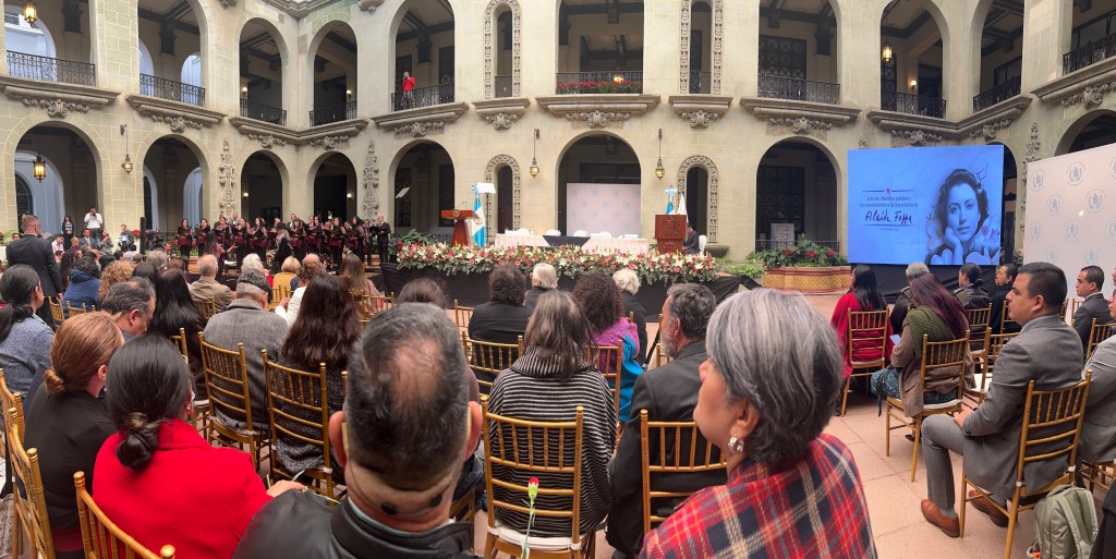 Es 3 de diciembre de 2024; hace 110 años, Alaíde Foppa nació en Barcelona, España. Hace 44 años, pero el 19 de diciembre, la académica feminista fue desaparecida, torturada y asesinada por el G2, la policía secreta del Ejército guatemalteco, bajo las órdenes de Romeo Lucas García. Hoy es una mañana fría, pero luminosa, aunque el techo del patio no deje ver el cielo azul de afuera. Faltan unos minutos para las nueve de la mañana, hora en la que está anunciado el comienzo del acto. Este lugar ha pasado por varias transformaciones: de ser el palacio de un dictador, pasó a ser utilizado como oficinas de gobierno. Después, Álvaro Colom, gobernante de izquierda, lo convirtió en Palacio Nacional de Cultura. El gobierno anterior lo mantenía cerrado al público y rodeado de fuerzas policiales y militares; con la entrada de Bernardo Arévalo, nuevamente se volvió a abrir al público y alberga exposiciones de artes plásticas.