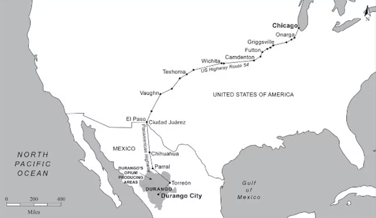Esta heroína era obtenida de la amapola cultivada en las montañas de Durango, la cual se procesaba en laboratorios secretos en algunos pueblos a pie de monte. Luego era escondida en automóviles y conducida por la carretera Panamericana hasta Chicago, un viaje de 50 horas a lo largo de una ruta ya bien conocida por dos generaciones de inmigrantes.