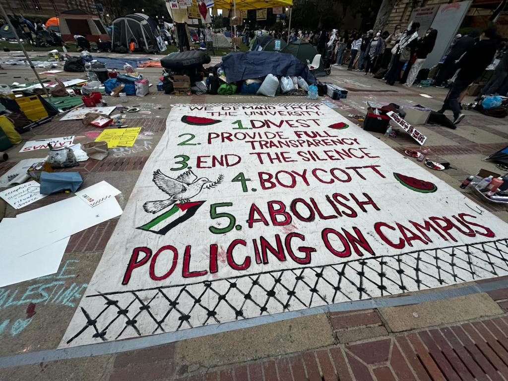 Al día siguiente, los agresores soltaron ratones por el campamento, y para la noche, las autoridades universitarias, encabezadas por el rector Gene Block, publicaron un comunicado en el que calificaron el campamento de ilegal y violatorio de la política universitaria, amenazando con sanciones a quien se mantuviera en él. Ante tal situación, lxs estudiantes decidieron permanecer, con el apoyo de sus profesorxs y demás trabajadorxs. Al mismo tiempo, el comunicado oficial fue la luz verde para el brutal ataque sionista de la madrugada entre el 30 de abril y el 1.° de mayo.
