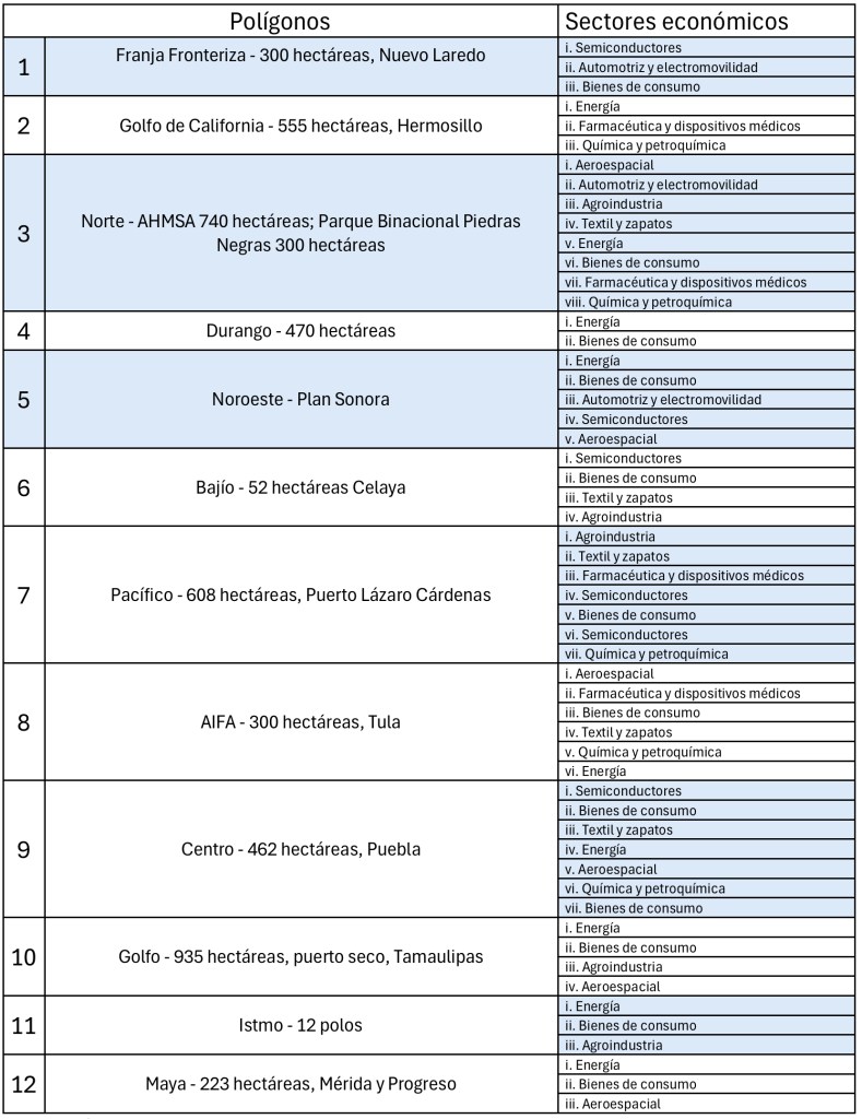 Ahora bien, dado que el objetivo último de la actual administración es alcanzar un desarrollo económico equitativo y sustentable para la prosperidad compartida, el Plan México participa de un objetivo integrador de fortalecimiento del mercado interno nacional, mediante el impulso de la producción industrial en sectores clave de la economía. De allí que la estrategia emprendida consista en la creación de Polos de Bienestar, trazados en 12 polígonos (Cuadro 1), dirigidos a impulsar a lo largo y ancho del país la producción en los siguientes sectores: a) textil y de calzado, b) farmacéutico y de dispositivos médicos, c) agroindustrial, d) de semiconductores, e) energético, automotriz y de electromovilidad, f) químico y petroquímico, g) de bienes de consumo y h) aeroespacial.