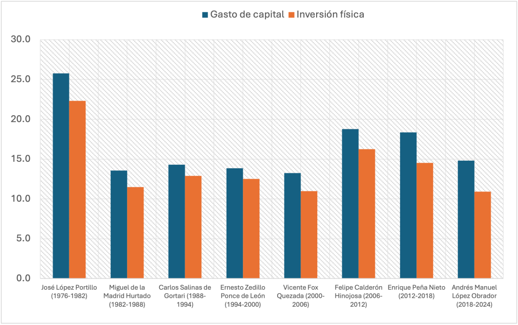 México: Gasto de capital y de Inversión física del sector público, 1977-2024