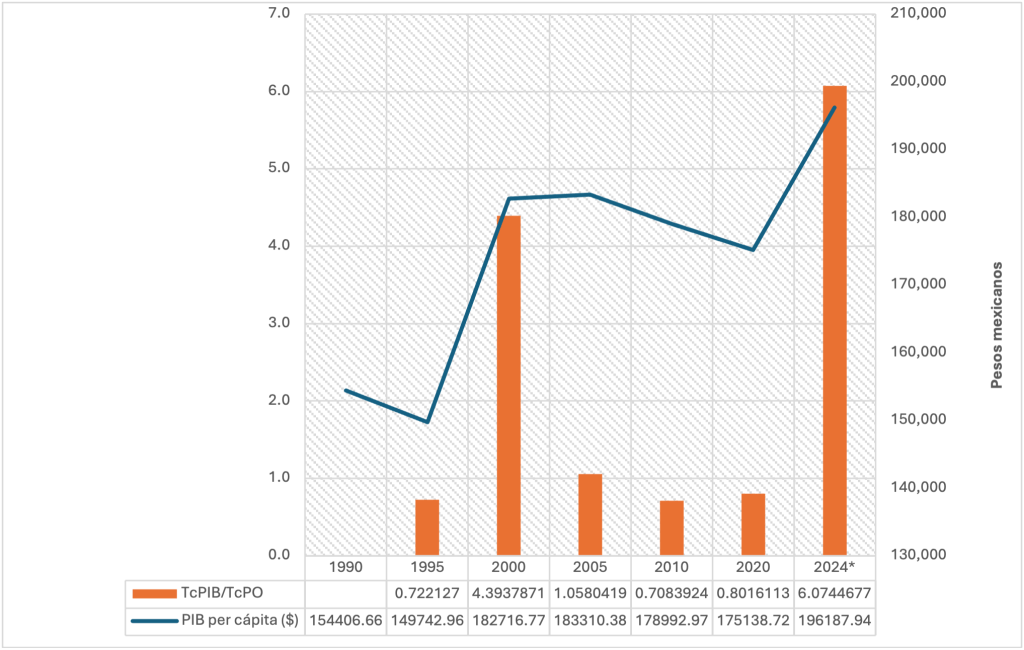 Con la intención de romper con la concepción estática característica de los análisis neoliberales y evidenciar la falta de eficacia económica de los gobiernos tecnócratas, en la Gráfica 1 se presenta el comportamiento de la relación entre la Tasa de Crecimiento del PIB (Tc PIB) y la Tasa de Crecimiento de la Población (Tc PO), así como el comportamiento del PIB per cápita en los últimos 34 años. En ella se observa tanto un notable estancamiento de la producción en los años que van del 2000 al 2020, como una igualmente notable recuperación en los años posteriores a la pandemia, lo que llevó al país a avanzar cuatro posiciones en el grupo de las 20 mayores economías del mundo, al pasar del lugar 16º al 12º, de acuerdo con datos del Banco Mundial.