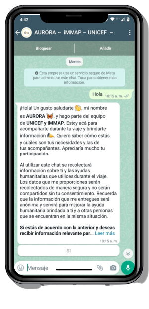 Por ejemplo, Aurora, un Chatbot diseñado por el UNICEF y ¡MMAP para la población migrante en el noroccidente de Colombia (la que forma parte de la región del Darién), Panamá y Costa Rica, brinda información sobre ayuda humanitaria a la que se puede acceder en la ruta, así como cuentos infantiles y recomendaciones de autocuidado. No obstante, mientras las personas migrantes en tránsito interactúan con la aplicación digital, Aurora recaba datos para la caracterización de los movimientos migratorios y mapea los lugares desde los cuales las personas migrantes acceden al Chatbot (3iSolution, s/f).