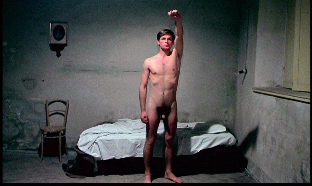 La primera resistencia procede de nuestra fisiología, de la parte de ella ardua de socializar. Ni siquiera la sumisión absoluta, la de prestarse al placer administrado por la Vaccari y Guido, permite que el cuerpo sea absolutamente de los fascistas de vanguardia. La segunda, la de Ezio, muestra a un colaboracionista que, descubierto en la falta, planta cara haciendo un saludo socialista. Socialista o antitiránico porque la imagen de Ezio con el puño levantado recuerda a Harmodio, el joven amante de Aristogitón, que forma parte del conjunto de los tiranicidas de Atenas.